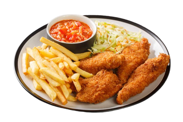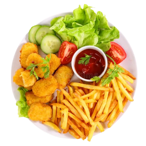 Plato de nuggets de pollo (6) con patatas fritas, ensalada i con opción de bebida.