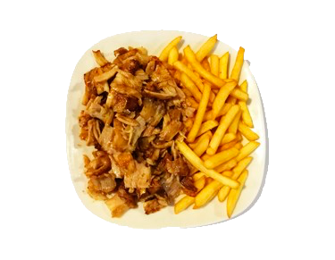 Plato de Carne de kebab i patatas fritas con opción de bebida.